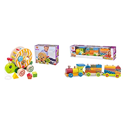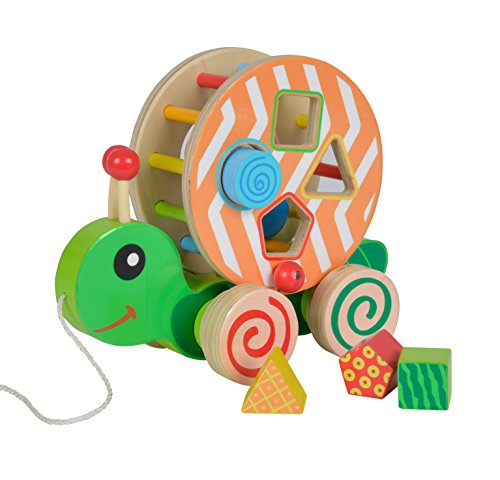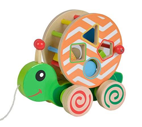 Produkt 1: Zum Nachziehen – Kinder ab einem Jahr können das süße Stecktier an der Schnur hinter sich herziehen; Dadurch setzt sich das runde Schneckenhaus in Bewegung, es beginnt sich zu drehen und klappert; Befinden sich die Steckbausteine im Inneren, so wirbeln diese lustig durcheinander