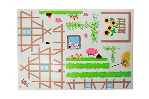Großer Bauernhof – der 36x51cm große Bauernhof besteht Sämtliche einer Spielplatte, einem Bauernhofhäuschen, einem Stall, Zäunen und Tieren. Die Gebäude können von den Kindern mit Stickern beklebt werden