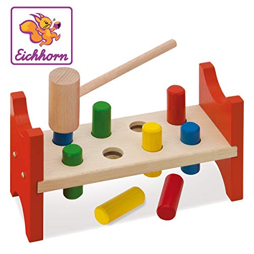 Die Klopfbank wird jeder Buchholz gefertigt. Ganz Einzelteile sind so groß, dass Kinder ab einem Jahr sie gut greifen können. Allesamt Holspielwaren von Eichhorn werden regelmäßig von unabhängigen Prüfinstituten getestet.