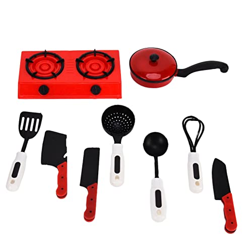 Dieses Spielzeug-Set enthält eine flache Schaufel, einen Löffel, ein Küchenmesser, eine Hohlschaufel, einen rechteckigen Herd, einen hohen Topf mit Einzelgriff, einen hohen Topf mit Doppelgriff, einen Löffel, einen Spatel, einen runden Herd und einen Deckel.