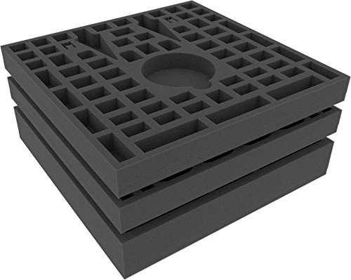 Das Aufnahme in der Box zeigt den Zustand, wenn das Spielbrett in der Brettspiel-Box bedrückt dem Schaumstoff liegt! Der Schaumstoff ragt dennoch minimal über den Rand der Box. Die Einlagen haben die Abmessungen: 285 mm x 285 mm x 30 / 50 mm und passen darob perfekt in die original Rebellion Brettspielbox.