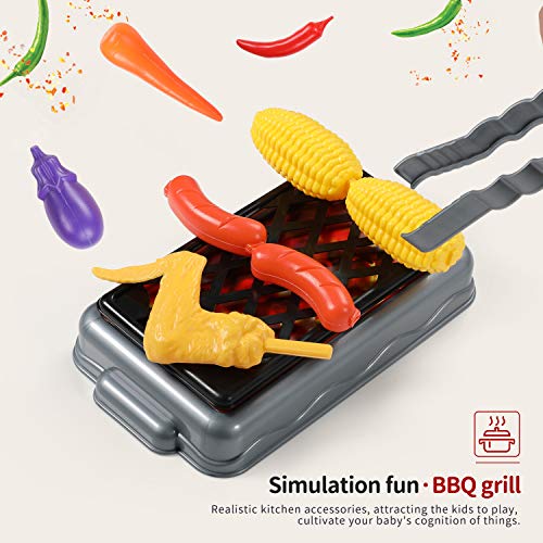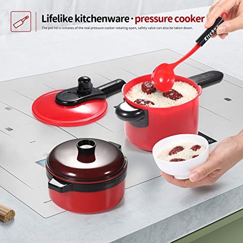 【24 KINDERKÜCHE TOPFSET】Küche Spielset inklusive Schnellkochtopf, Pfanne, Wasserkocher, Grill, Suppentopf, 11 Utensilien, komplettes Set inklusive 8 Lebensmitteln. Kinder können so tun, als würden sie kochen oder grillen. Viel Spaß mit diesem Küchenspielzeug!