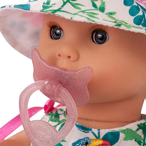 Lieferumfang: 1 x Bade-Puppe Sleepy Aquini Girl Blooms, in 12-teiligem Set mit Sommerkleid mit Hut, Dollocs, Badetuch, Badewanne, Windel, Unterhose, Badeschwamm, Schnuller und Trinkflasche von Götz.