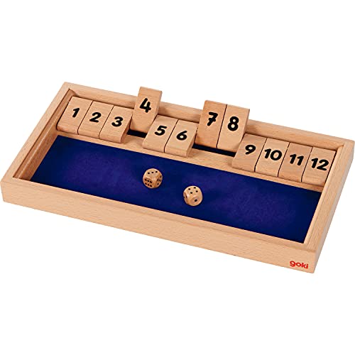 goki 56651 Würfelspiel Shut The Box 32,2 x 17,3 x 3,2 cm, Holz, 2 Würfel, Natur/blau