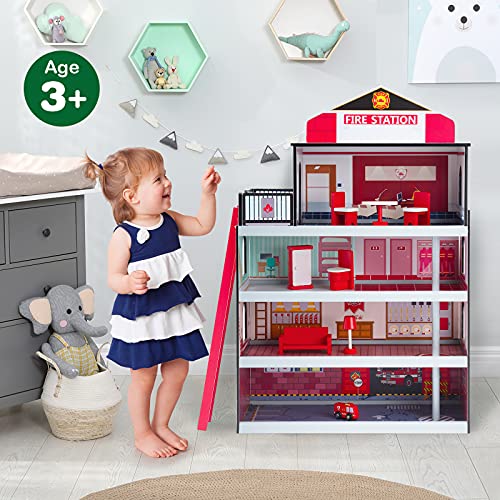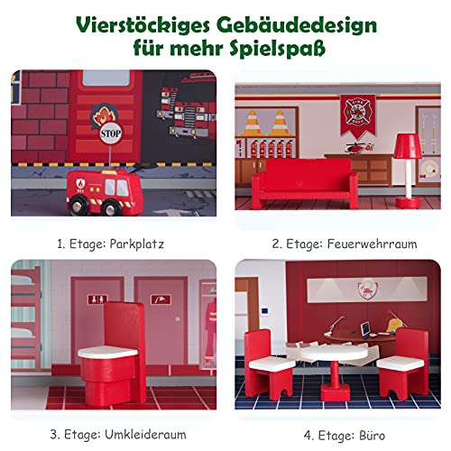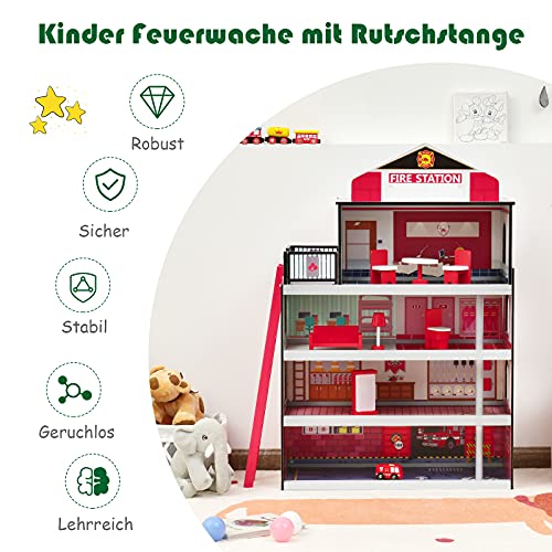 GOPLUS Kinder Feuerwache mit Rutschstange, Puppenhaus Set mit Feuerwehrauto, Hubschrauber, Möbeln & Zubehör, Große…