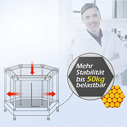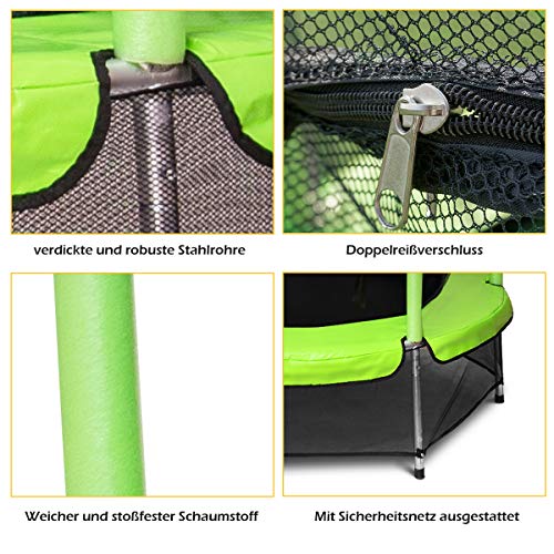 Hochwertige Materialien, sehr stabil und langlebig: Das Kindertrampolin verfügt über stabile Metallrahmen. Standbeine und Netzstangen sind aus 25-mm-Stahlrohren. Somit ist das Trampolin lange haltbar. Darüber hinaus ist das Tuch sehr elastisch und hat eine reißfeste Funktion.
