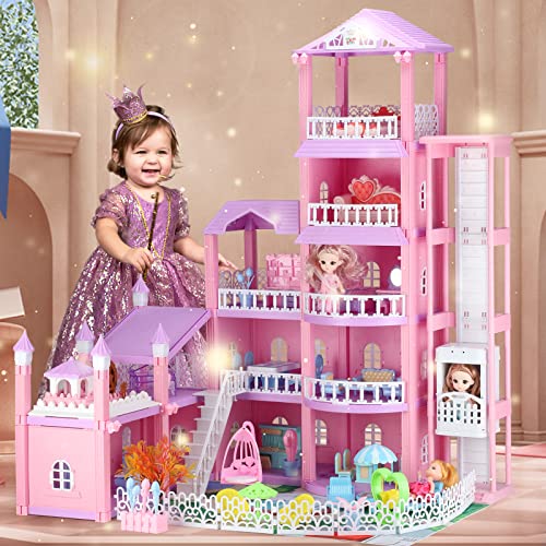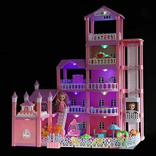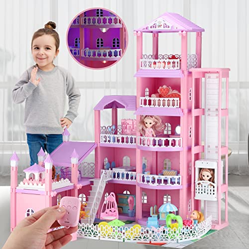 Riesiges Puppenhaus mit ferngesteuertem Fahrstuhl und buntem LED-Licht, 5-stöckiges Puppenhaus mit 2 Puppen, 12 Räumen und Möbelzubehör