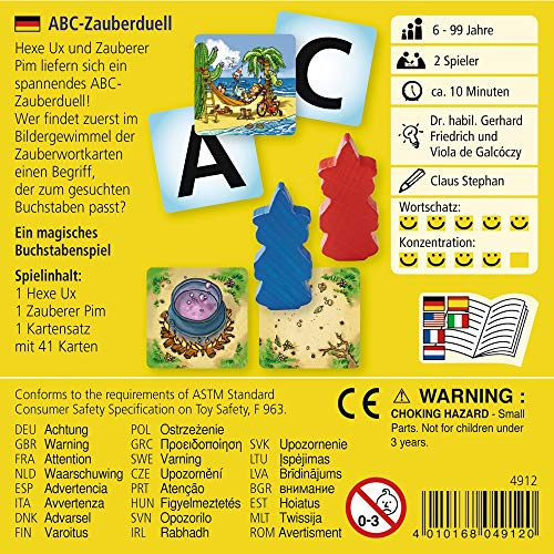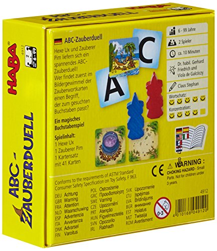 Im ABC-Zauberduell von HABA stöbern Zauberer Pim und Hexe Ux nach Zauberwörtern. Sie verbergen sich in den Wimmelbildern der Zauberwortkarten. Die magischen Wörter müssen jeweils mit dem vorgegebenen Buchstaben beginnen. Wer findet zuerst ein Detail in dem Fotografie, das mit dem Buchstaben beginnt? Die kleinen Magier brauchen Adleraugen und schnelle Reaktion bei diesem Laufspiel. Wer die meisten Zauberwörter findet und als Erster den Zauberkessel erreicht, gewinnt das ABC-Zauberduell. Das Buchstabenspiel fördert spielerisch den Wortschatz und die sprachliche Entwicklung. Eine kooperative Version stärkt den Teamgeist.