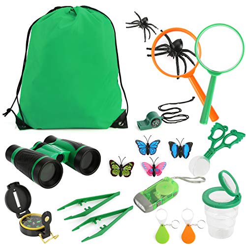 ✔️【18 Pöbel Explorationskit für】 HALLOWEEN, URLAUB, SOMMER ODER DAS GANZE JAHR ÜBER; beinhaltet hochwertig funktionierende Ferngläser; Aufbewahrungstasche; Taschenlampe; Kompass; sphärischer Clip; Pinzette; Handlupe; Schlüsselbund Lupe; Insektenlupen-Schrumpfschale; Faux Spider; Faux Butterfly.