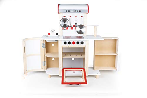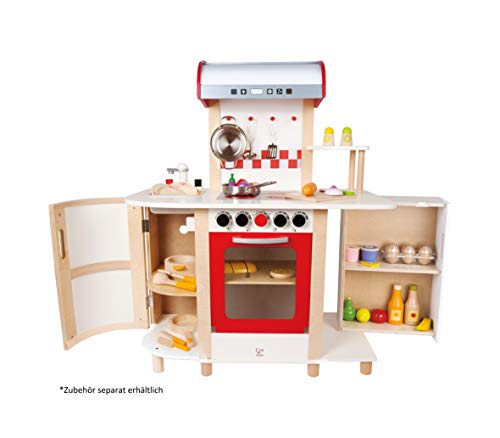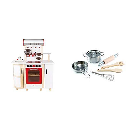 Hape E8018 – Küchentraum, Kinderküche inklusive Zubehör (Topf, Pfanne, Pfannenwender und Schöpflöffel), Spielküche leer Holz
