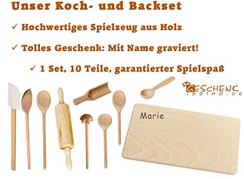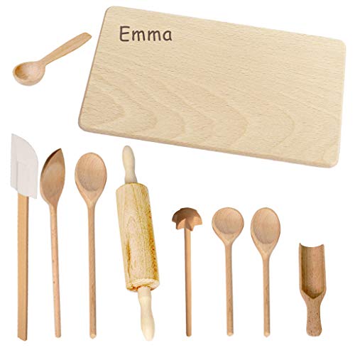 ★ 10-teiliges Kinderkochset: Backgeschirr besteht aus einem Schneidebrett mit Namen graviert, Nudelholz, Teigschaber, 3x Koch- und Rührlöffel, Mehlschaufel, Quirl, Dosierlöffel und einem Konfitürelöffel.