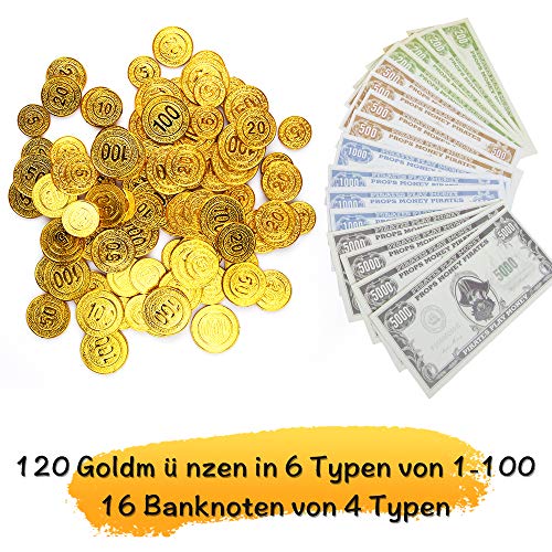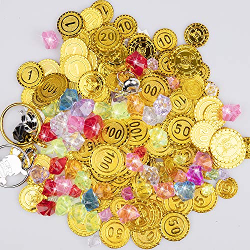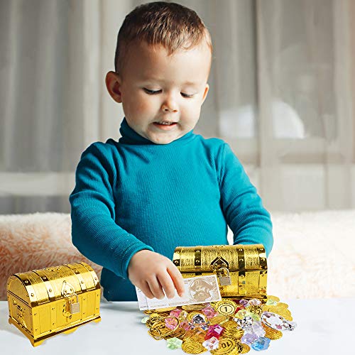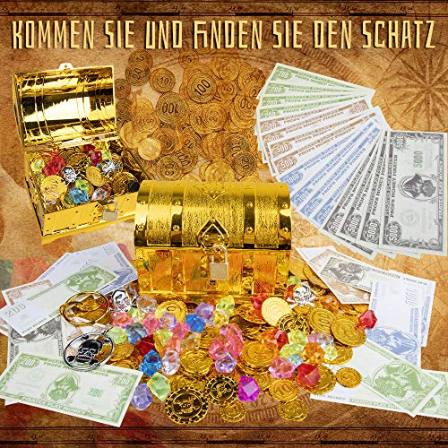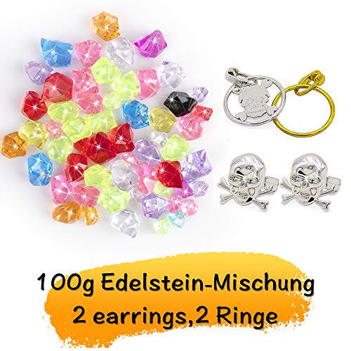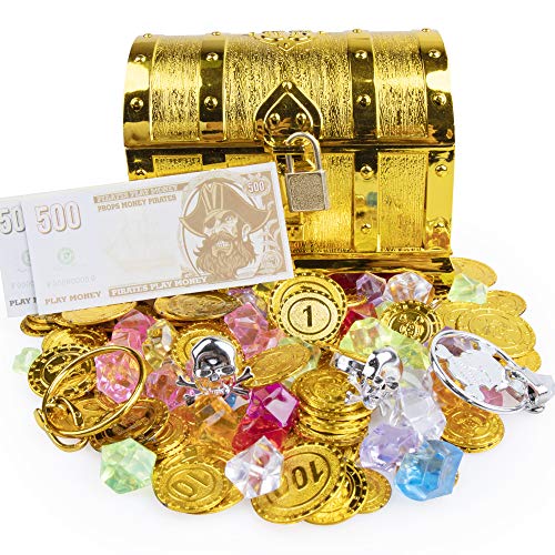 Piratenspielzeug-Set: 120pcs Pirat Goldmünze, 100g Edelsteine, 2pcs Piraten Ringe, 2pcs Ohrringe, 16pcs Papiergeld,1pcs Schatztruhe mit Schloss und Schlüssel.