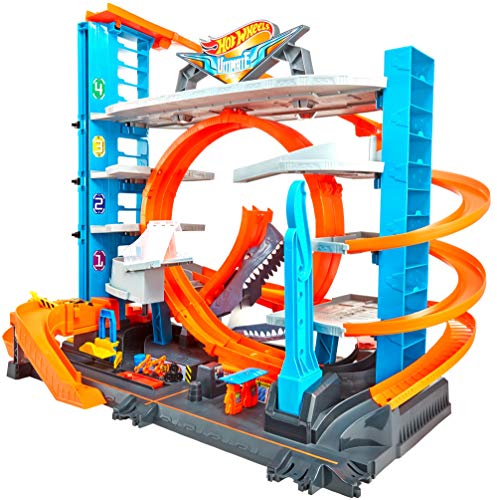 Hot Wheels Garage, Hot Wheels Hai Parkgarage inkl. 2 Spielzeugautos, mit Autorennbahn, Looping Tracks, Auto Spielzeug Aufzug und Platz für +90 Autos, Höhe: 63cm, Spielzeug ab 5 Jahre, FTB69
