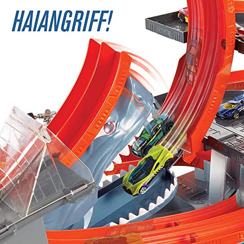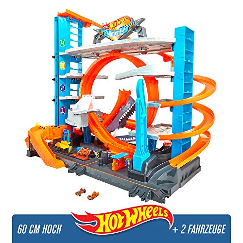 Über den Looping mit Doppelbahn rasen die Autos zurück nach Hot Wheels City oder werden vom Hai verschlungen