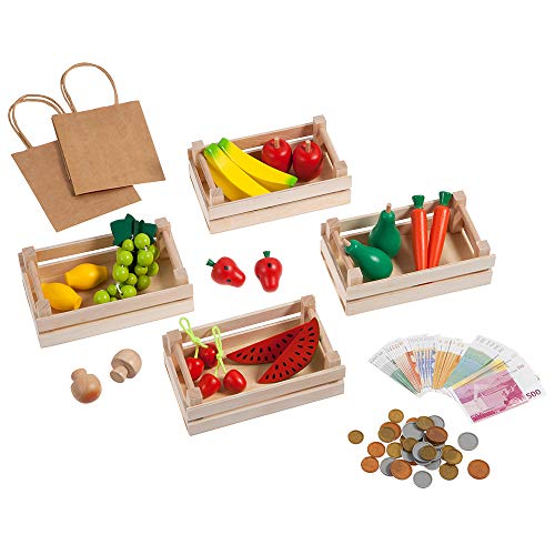 Zubehörset umfaßt: 4 Holzkörbe, 2 Bananen, 1 Weintraube, 2 Erdbeeren, 2 Äpfel, 2 Rübe, 2 Zitronen, 2 Möhren, 2 Kirschen, 2 Melonen, 2 Pilze, 2 Einkaufstüten ansonsten Spielgeld