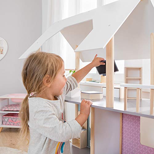 Das liebevoll, modern gestaltete Puppenhaus ist für Ankleidepuppen (z.B. Barbie) bis 30 cm geeignet.
