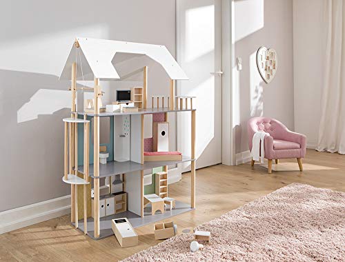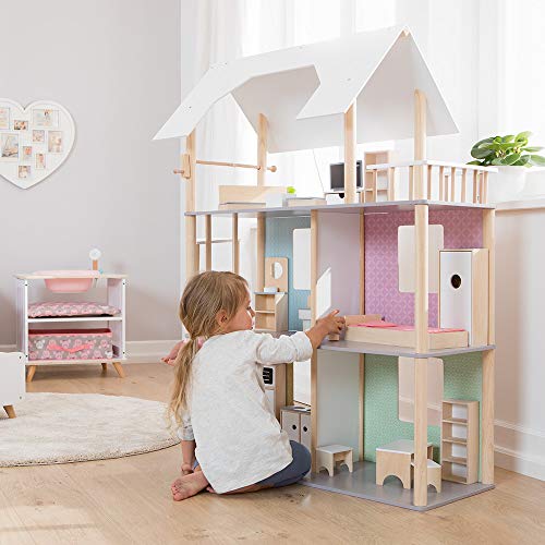 Das riesige Puppenhaus aus Holz hat eine Höhe von 116 cm und passt durch die angenehme Farbgestaltung in jedes Kinderzimmer.