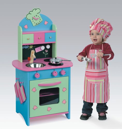 Tolle, farbig lackierte Spielküche, die Neigung zum Am Herd stehen macht. Mit Abwasch, Herdplatten, Backofen mit herausnehmbaren Backblech, drehbaren Knöpfen mit „Klick“-Geräusch, 3 Schubfächer, Lernuhr, magnetischer Tafel und seitlichen Kochutensilienhalter. Sonderlich süß ist das textile Zubehör bestehend aufgebraucht Schürze, Kochmütze und 2 Topflappen. (ohne Dekoration).