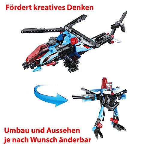 Die Anomalie dieses Modells ist, dass man es in zwei Varianten aufbauen kann. Bei der ersten Unterart handelt es sich um einen Kampfhubschrauber. Mit ein paar wenigen Handgriffen können Sie diesen in einen Roboter verarbeiten. Im Unterschied dazu können Sie auch Ihre eigenen Ideen mit einbeziehen und Ihr ganz individuelles Modell zusammenstellen.