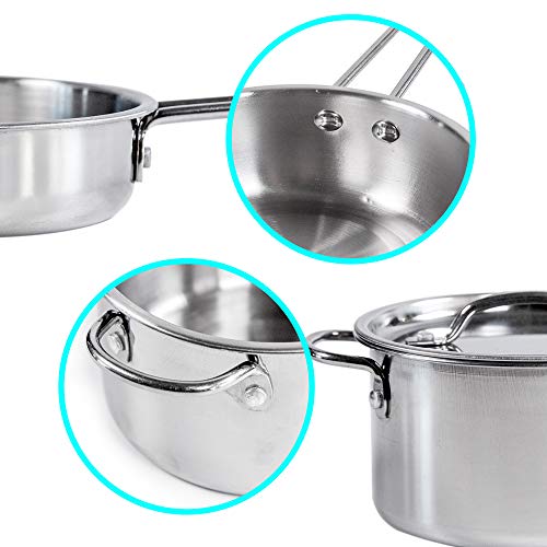 MEHRERE EIGENSCHAFTEN: Das Küchenspielzeug Set besteht leer Edelstahl, enthält Pfanne ansonsten Töpfe Per Deckel ansonsten Griffen, 4 Geschirr leer Edelstahl ansonsten Holz, Schürze, Kochmütze, Ofenhandschuh, Topflappen ansonsten Gemüse Lebensmittel.