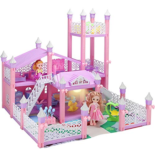 【Fully Furniture & Accessories】3 Floors princess castle dolls house 8 room includes bedroom, living room, kitchen and dining room, bathroom,piano room,recreation room. 3D building dolls house also with additional accessories like decorative items and common everyday utensils. Kitchen unit, dining table, dining chair,food accessories.Bedroom unit-bed,dressing table.Bathroom unit-shower,toilet.Recreation room unit- swing,wooden horse.Dolls and dog included.