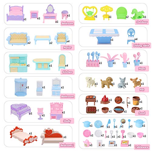 【Vollständige Möbel und Accessoires】 4 Stockwerke Prinzessin Schloss Puppenhaus 20 Zimmer umfasst Schlafzimmer, Wohnzimmer, Küche und Esszimmer, Bad, Klavierzimmer, Aufenthaltsraum. 3D-Puppenhaus auch mit zusätzlichem Zubehör wie Dekorationsgegenständen und alltäglichen Utensilien. Kücheneinheit, Esstisch, Esszimmerstuhl, Lebensmittelzubehör. Schlafzimmer-Bett, Schminktisch. Badezimmer-Einheit-Dusche, Toilette, Spiegel. Erholungsraum-Schaukel, Holzpferd. Puppen und Hund inklusive.