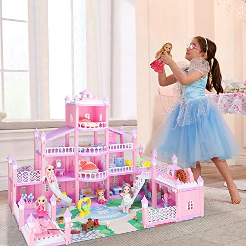 KAINSY Puppenhaus, 4 Tier Holiday House Möbeln und Zubehör Puppenhaus and Puppenhaus Zubehör and 3 Doll, 3D Großes…