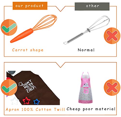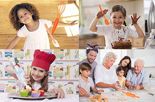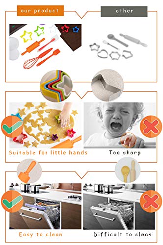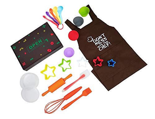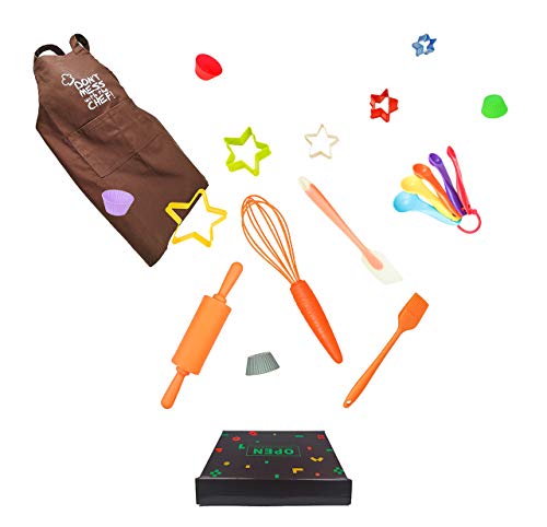 Kinder-Backgeschirr-Set anhand 18 bunten Kochutensilien ferner Zubehör. Lieferumfang: Eine Backschürze, 4 Silikon-Cupcakes, 5 sternförmige Ausstechformen, 5 Messlöffel, Schneebesen, Nudelholz ferner Spatel, Silikon-Werkzeug, hitzebeständig bis 230 °C, spülmaschinenfest im oberen Geschirrkorb. Vor dem ersten Software spülen. Farben des Zubehörs können modifizieren.
