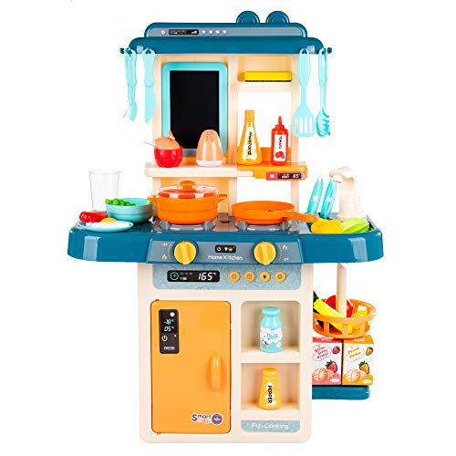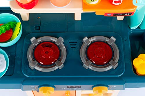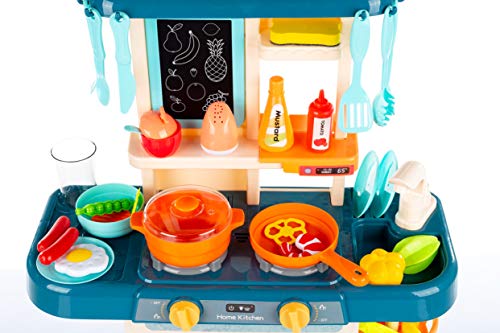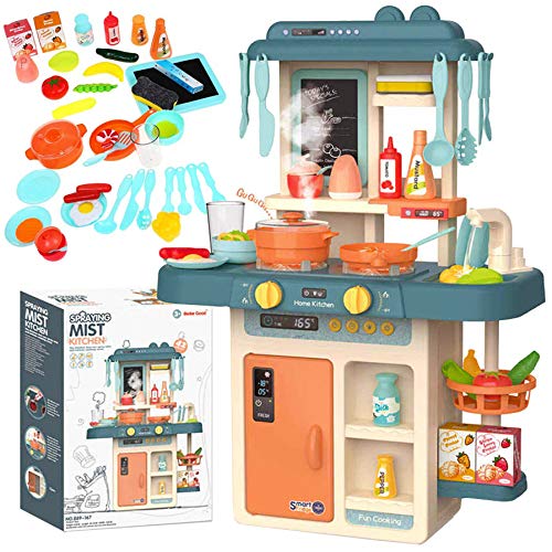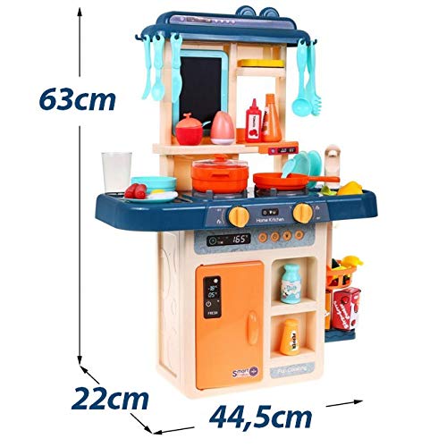✔️SPIELKÜCHE MIT SOUND UND LICHTEFFEKTEN DAMPF – Waschbecken mit Wasserhahn Schneidebrett Regal, Herdplatten (Licht, Ton, Wasserdampf) Eierkocher (Licht, Ton) Traufe interactive Trockner Obst und Gemüse, (Karotten, Paprika, Zitronen, Trauben) Kühlschrank, Besteckhaken Kreidetafel (Kreide und Schwamm inklusive)