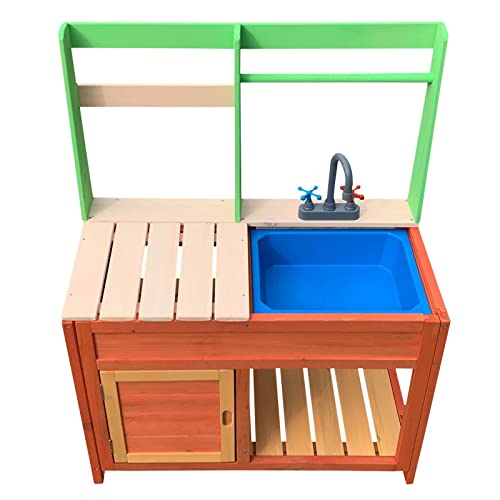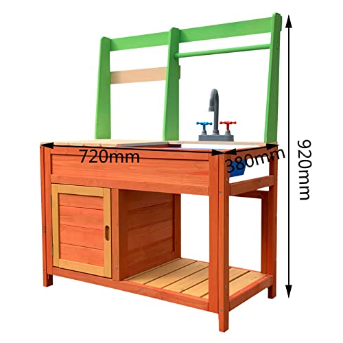 Die Matschküche verfügt über ein großes Schüttstein, in dem mit den unterschiedlichsten Materialien experimentiert werden kann. Über der Abwasch befinden sich ein Wasserhahn samt Knäufen für warmes und kaltes Wasser. Diese dienen der Optik und lassen die Küche für die Kleinen realistisch schaffen. Für Utensilien wie Eimer, Töpfe oder Förmchen gibt es genügend Stauraum unter der Abwasch. Denn dort befindet sich eine große Ablagefläche.