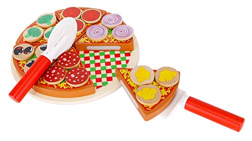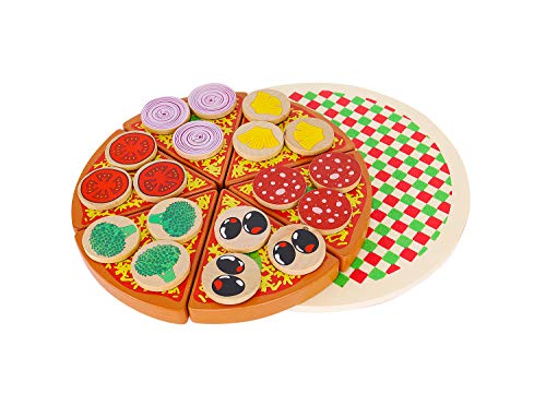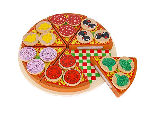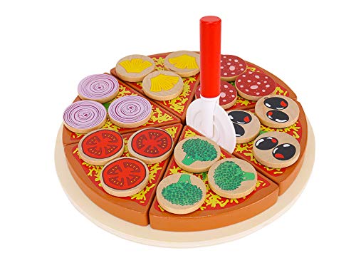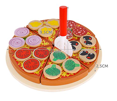 Die Holzpizza mit Zubehör ist ideal für einen kleinen Koch. Es ist ideal zum Kochen oder Feiern. Pizzastücke und ihre Zusätze wurden mit Klettverschlüssen kombiniert, damit sie geschnitten werden können und das Gemüse beim Servieren nicht herunterfällt.