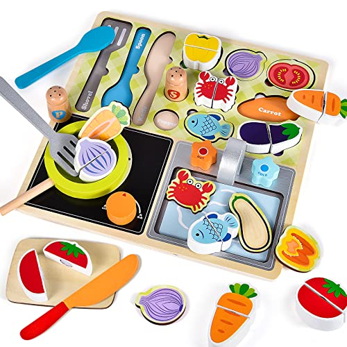 MEHRERE MÖGLICHKEITEN ZU SPIELEN – Dieses Holzspielzeug-Küchenset ist perfekt für vorgetäuschte Spielmahlzeiten und kann aka ein Puzzle sein. Ihr Baby muss jedes Nahrungszubehör in die entsprechende Rille legen. Das englische Wort des Zubehörs ist auf der Bodenplatte der Nut aufgedruckt. Durch dieses Spiel wird Ihr Nachwuchs von seiner vorgetäuschten Spielküche fasziniert sein.