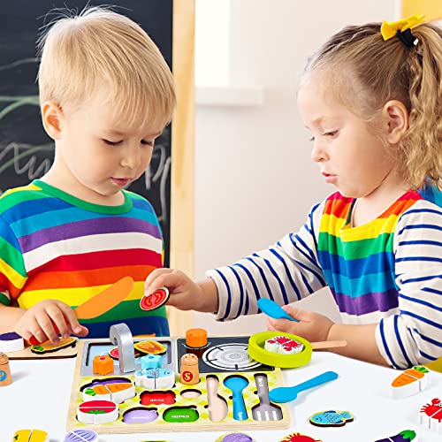 MEHRERE MÖGLICHKEITEN ZU SPIELEN – Dieses Holzspielzeug-Küchenset ist perfekt für vorgetäuschte Spielmahlzeiten und kann auch ein Puzzle sein. Ihr Baby muss jedes Nahrungszubehör in die entsprechende Rille legen. Das englische Wort des Zubehörs ist auf der Bodenplatte der Nut aufgedruckt. Durch dieses Spiel wird Ihr Kind von seiner vorgetäuschten Spielküche fasziniert sein.