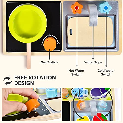 UMFANGREICHES KÜCHENSPIELSET- Dieses Küchenzubehör-Set aus Holz für Kinder besteht aus einem Spielzeugherd, Pfanne, Schaufel, Löffel, Messer, Spüle, Schneidebrett, Lebensmittelspielzeug – Gewürze, Fisch, Krabben, Auberginen, Karotten, Tomaten, Zwiebeln und einem hölzernen Küchentablett für alle einstellen.