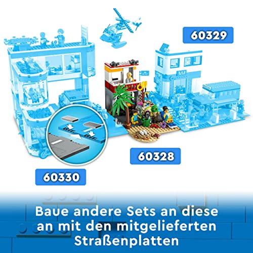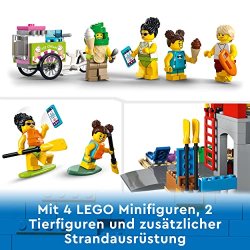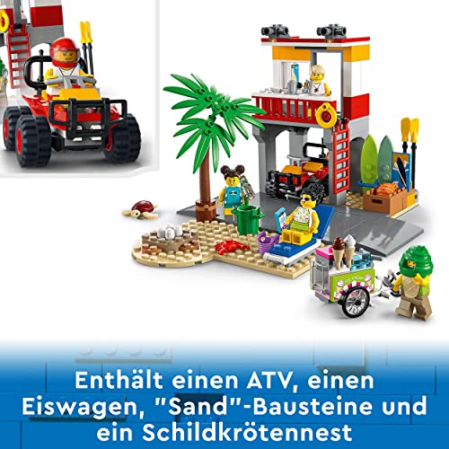 Dieses LEGO City-Set enthält eine zweistöckige Rettungsschwimmer-Station, einen Spielzeug-Geländewagen, einen Eiswagen und eine Strandkulisse mit einer Palme und „Sand“-Steinen