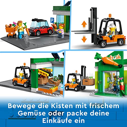 Dieses LEGO City Shop Spielset enthält einen Spielzeug-Supermarkt, ein Elektroauto und einen Gabelstapler mit Hebefunktion sowie eine LEGO Straßenplatte
