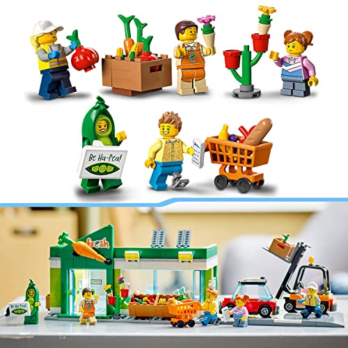 Enthält 5 Minifiguren: den Letter Mr. Produce allesamt der TV-Abfolge LEGO City – Ereignis, einen Schildhalter in einem Erbsenschotenkostüm, einen Verkäufer und 2 Kunden