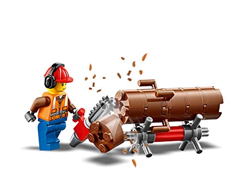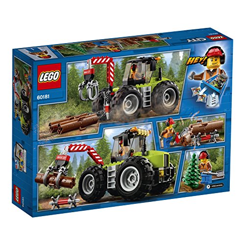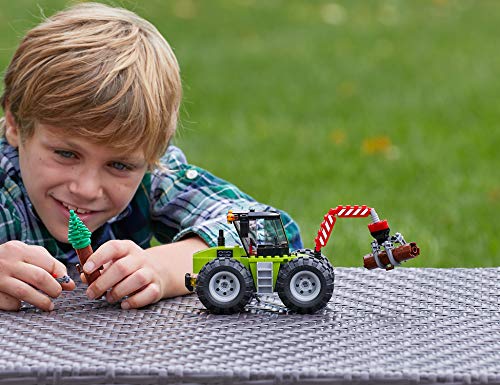 Enthält einen Forsttraktor mit riesigen Reifen und Ausleger mit zu öffnendem Greifer, zwei Ketten und einen kleinen baubaren Holzstand