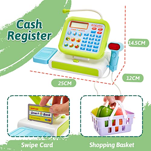 【Rollenspiel Kinder】Kinderspielzeug umfasst kasse kinder, Spielgeld spielzeug, Einkaufskarten, Lebensmittel ferner Einkaufskörbe. Kasse Spielzeug Größe: 25* 14.5* 12cm. Benötigt 3 Batterien AA (nicht enthalten).