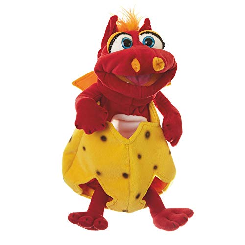 Die Living Puppets Handpuppe „Klein Ottilie im Ei“ hat sich momentan die Gesamtheit der Eierschale befreit und betrachtet voller Neugier seine Umwelt. Die großen blauen Augen mit den orangen Augenliedern und den kräftigen schwarzen Wimpern verleihen dem innovativ geschlüpften Drachenmädchen ein bezauberndes Äußeres. Die liebenswerte Erscheinung des kleinen Drachenmädchens wird durch den orangen Haarbüschel zwischen den Ohren und dem weißen Bauchlatz vollendet. Anders ist der Körper feuerrot. Das Klappmaul bespielen Sie einfach über den Handeingang auf der Unterseite der Figur.