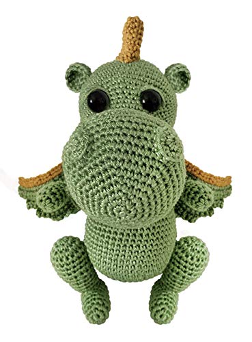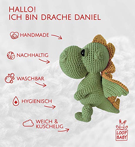HANDMADE KUSCHELTIERE: Der gruene Drache Daniel ist mit massenhaft Liebe von Hand gehäkelt. Unser Kinderspielzeug für Junge & Mädchen wird rundum tragbar von Müttern in einem Sozialbetrieb gefertigt.