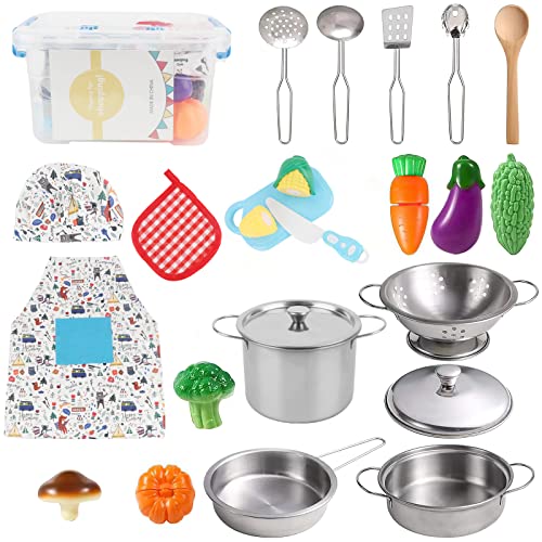 🍳Kinderküche Zubehör Set: Das spielküche zubehör set enthält 27 Teile: 1 x Kochmütze, 1 x Schürze, 1 x Holzlöffel, 1 x Plastikmesser, 1 x Schneidebrett, 1 x Kochhandschuh, 1 x Quadratische Unterlage, 9 x Spielzeugobst und -gemüse, 11 x Edelstahl-Küchenutensilien.