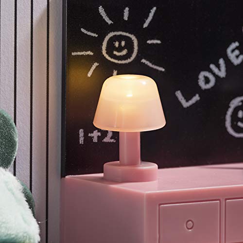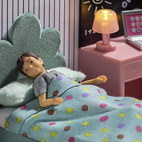 GRÖSSE UND LIEFERUMFANG: 1 Schreibtisch (BHT: 6,3×9,5×3,5 cm) mit LED-Tischlampe und Kreidetafel, 1 Laptop, 1 Hocker, 1 Bett (BHT: 7,2x8x11 cm) mit öffnungsbarer Schublade, abnehmbarem Kopfteil, 1 Bettdecke, 1 Kissen, 1 Matratze, 1 Ausschnitt Batterie (CR2032). Kunststoff und Stoff. Fertig montiert. Figuren nicht im Lieferumfang enthalten.
