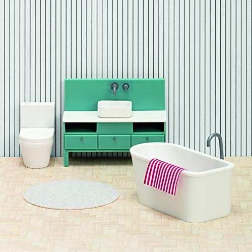 Lundby Puppenhaus Badezimmer Möbel – 5 teilig – Miniatur Toilette, Waschbecken, Teppich und Miniatur Badewanne – Toilette Puppenhaus Möbel Set – Puppenmöbel Puppenhaus Zubehör – 11cm Puppen 1:18