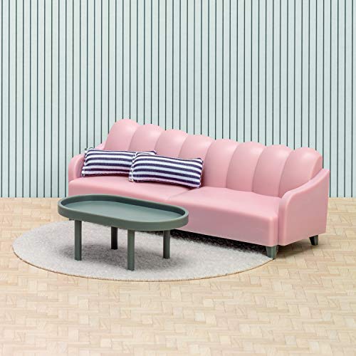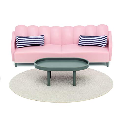 LUNDBY Puppenhaus Wohnzimmer Möbel Set 5-teilig – Sofa Couch, Couchtisch, Teppich, 2X Kissen – Puppenhaus Möbel für Miniatur Haus – Puppenzubehör Set für 11 cm Puppen im Maßstab 1:18