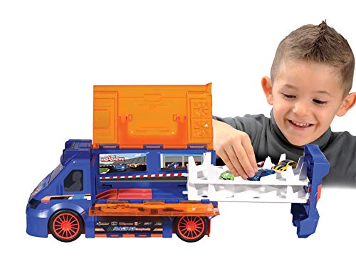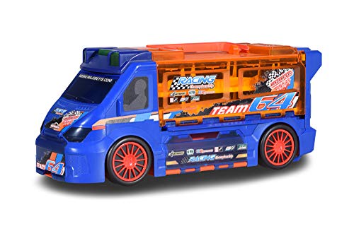 Wohin mit all den tollen Majorette Die-Cast-Autos, wenn es auf Reisen oder ans Ordnung machen geht? Ab in den Majorette Race N` Carry Van! Die Aufbewahrungsbox in Form eines Renntransporters ist selbst ein funktionsstarkes Fahrzeug, in dem bis zu 18 Majorette 7, 5-cm-Fahrzeuge übersichtlich Platz finden