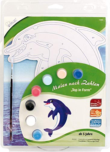Das Komplettset beinhaltet 1 bedruckte und gestanzte Malvorlage in Form eines Delfins, 1 Pinsel und 7 Acrylfarben, perfekt um sofort mit dem Malen zu beginnen