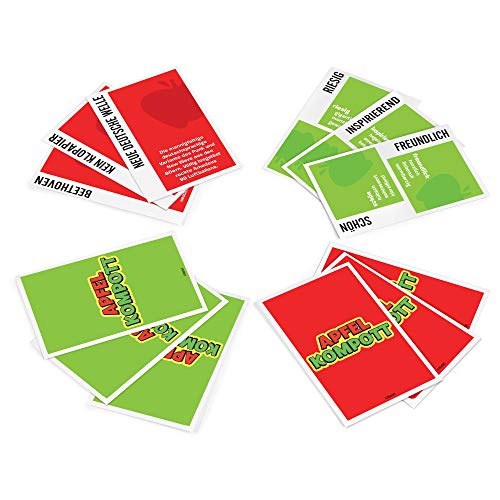 Enthält zwei Kartenarten: Auf den roten Apfelkarten steht ein Satz mit einem Substantiv, auf den grünen Apfelkarten ein Wiewort