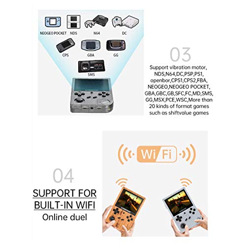 ✅【Integrierte Abwechslung klassischer Spiele】 Retro-Handheld-Spielekonsole RG351V, die mit Open Source-Linux-Systemen kompatibel ist und mehr als 20 Emulatoren unterstützt, darunter NDS, N64, DC, PSP, PS1, Openbor, CPS1, CPS2, FBA, NEOGEO, NEOGEOPOCKET, GBA, GBC, GB, SFC, FC, MD, SMS, GG, MSX, PCE, WSC, Transplantationsspiele usw. 20 Arten von Spielformaten. Mit Hilfe eines Vibrationsmotors und starker Vibration erhalten Sie ein beeindruckendes Spielerlebnis.