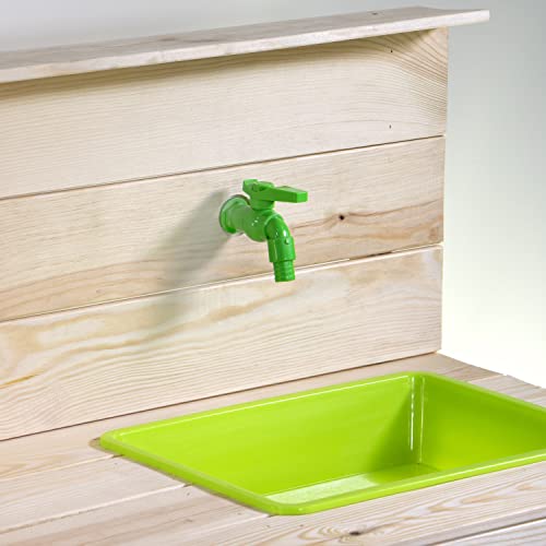 Die Kinderküche ist durch Ihre kompakte Bauweise allerbest robust und einfach zu reinigen. Das Abwasch ist herausnehmbar. Der funktionale Wasseranschluss ermöglicht es, direkt vor Ort Sand, Erde oder Niedergang von Spielzeug, Sandformen etc. abzuwaschen.